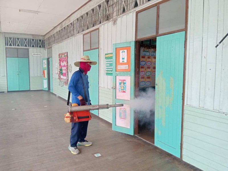 องค์การบริหารส่วนตำบลแม่น้ำคู้ ที่อนุเคราะห์การฉีดพ่นหมอกควันกำจัดยุงลาย เพื่อป้องกันและควบคุมโรคไข้เลือดออก โรคติดเชื้อไวรัสซิกา และโรคไข้ปวดข้อยุงลาย บริเวณภายในโรงเรียน