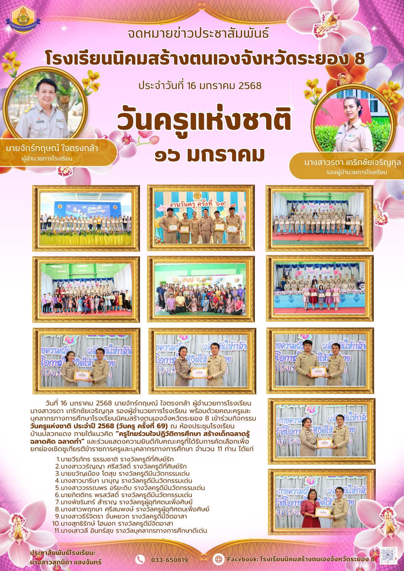 | วันที่ 16 มกราคม 2568 นายจักร์กฤษณ์ ใจตรงกล้า ผู้อำนวยการโรงเรียน นางสาวรดา เกริกชัยเจริญกุล รองผู้อำนวยการโรงเรียน พร้อมด้วยคณะครูและบุคลากรทางการศึกษาโรงเรียนนิคมสร้างตนเองจังหวัดระยอง 8 เข้าร่วมกิจกรรมวันครูแห่งชาติ ประจำปี 2568 (วันครู ครั้งที่ 69) ณ ห้องประชุมโรงเรียนบ้านปลวกแดง ภายใต้แนวคิด “ครูไทยร่วมใจปฏิวัติการศึกษา สร้างเด็กฉลาดรู้ ฉลาดคิด ฉลาดทำ” และร่วมแสดงความยินดีกับคณะครูที่ได้รับการคัดเลือกเพื่อยกย่องเชิดชูเกียรติข้าราชการครูและบุคลากรทางการศึกษา จำนวน 11 ท่าน ได้แก่