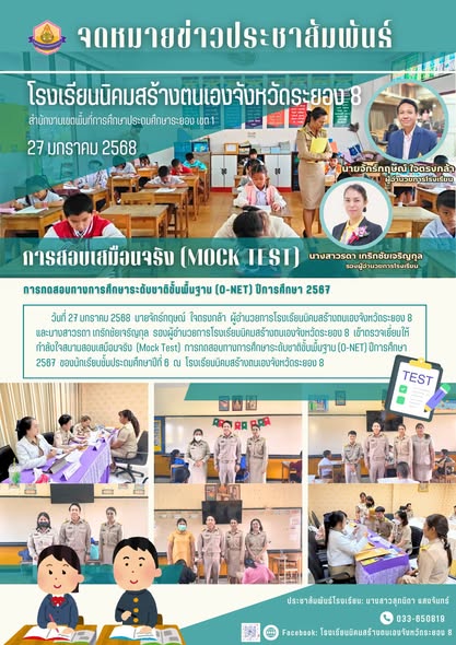 | วันที่ 27 มกราคม 2568 นายจักร์กฤษณ์ ใจตรงกล้า ผู้อำนวยการโรงเรียนนิคมสร้างตนเองจังหวัดระยอง 8 และนางสาวรดา เกริกชัยเจริญกุล รองผู้อำนวยการโรงเรียนนิคมสร้างตนเองจังหวัดระยอง 8 เข้าตรวจเยี่ยมให้กำลังใจสนามสอบเสมือนจริง (Mock Test) การทดสอบทางการศึกษาระดับชาติขั้นพื้นฐาน (O-NET) ปีการศึกษา 2567 ของนักเรียนชั้นประถมศึกษาปีที่ 6 ณ โรงเรียนนิคมสร้างตนเองจังหวัดระยอง 8 |
