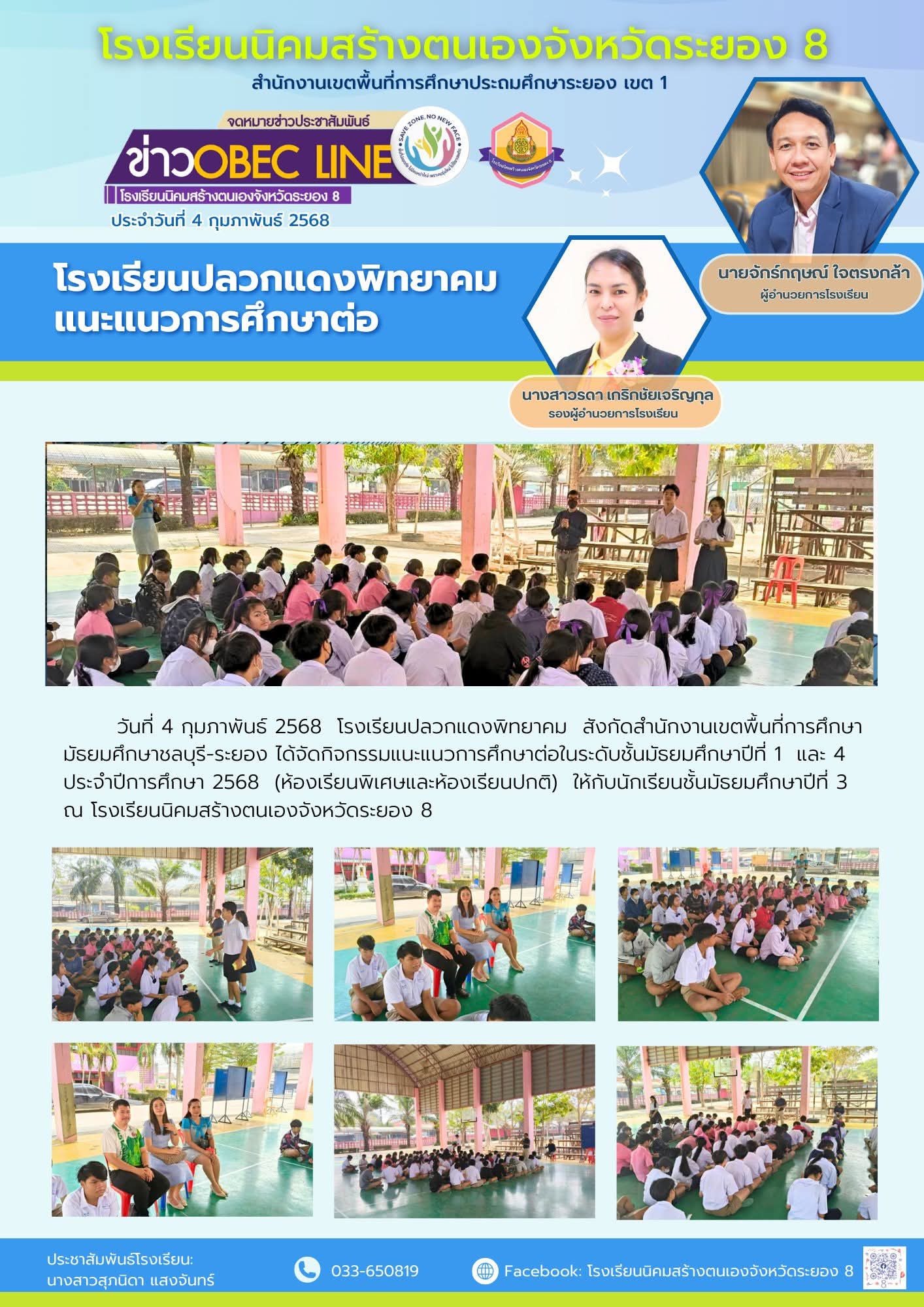 | วันที่ 4 กุมภาพันธ์ 2568 โรงเรียนปลวกแดงพิทยาคม สังกัดสำนักงานเขตพื้นที่การศึกษามัธยมศึกษาชลบุรี - ระยอง ได้จัดกิจกรรมแนะแนวการศึกษาต่อในระดับชั้นมัธยมศึกษาปีที่ 1 และ 4 ประจำปีการศึกษา 2568 (ห้องเรียนพิเศษและห้องเรียนปกติ) ให้กับนักเรียนชั้นมัธยมศึกษาปีที่ 3 ณ โรงเรียนนิคมสร้างตนเองจังหวัดระยอง 8 |